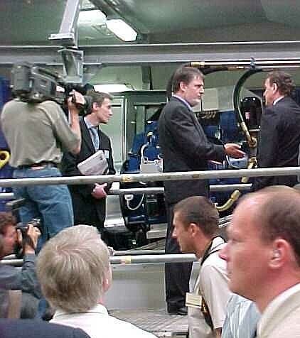 Klaus Burmeister erklärt dem Bundeskanzler Schröder die Funktion einer Maschine. |