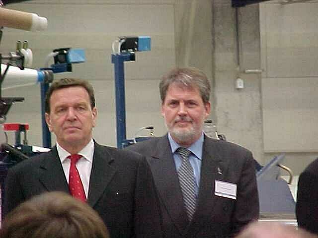 22.05.02: Bundeskanzler Schröder mit Klaus Burmeister bei der Einweihung der Rotorblattfabrik |